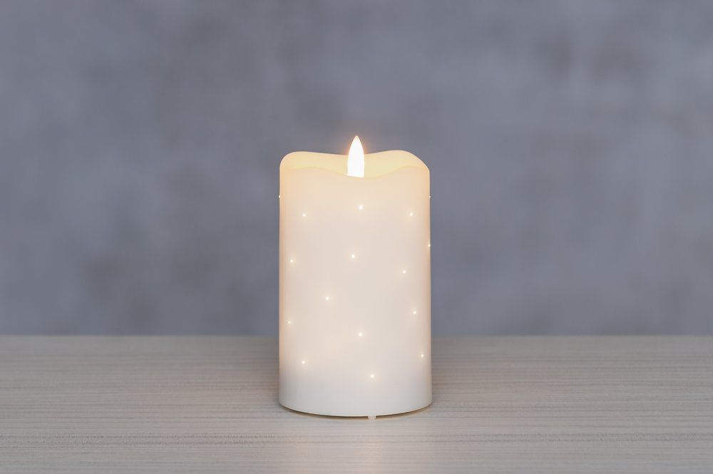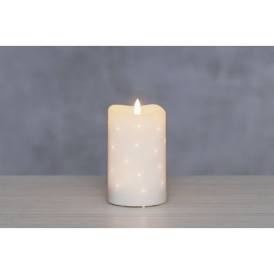 Detta eleganta LED-bordsljus har en vaxbelagd yta och en naturtro 3D-låga för ett varmt, realistiskt sken. Små, jämnt inbäddade ljuspunkter skapar en mjukt skimrande, stjärnliknande effekt på ljusets yta. Det subtila prickiga mönstret ger en mysig och dekorativ touch. Säkra och kladdfria – ingen brandrisk, inget droppande vax och ingen rök. LED-ljus är perfekta för användning i sovrum, vardagsrum, fönsterbrädor med mera. Drivs med 3 st AA batteri (ingår EJ) och har en timer funktion. 6 timmar på