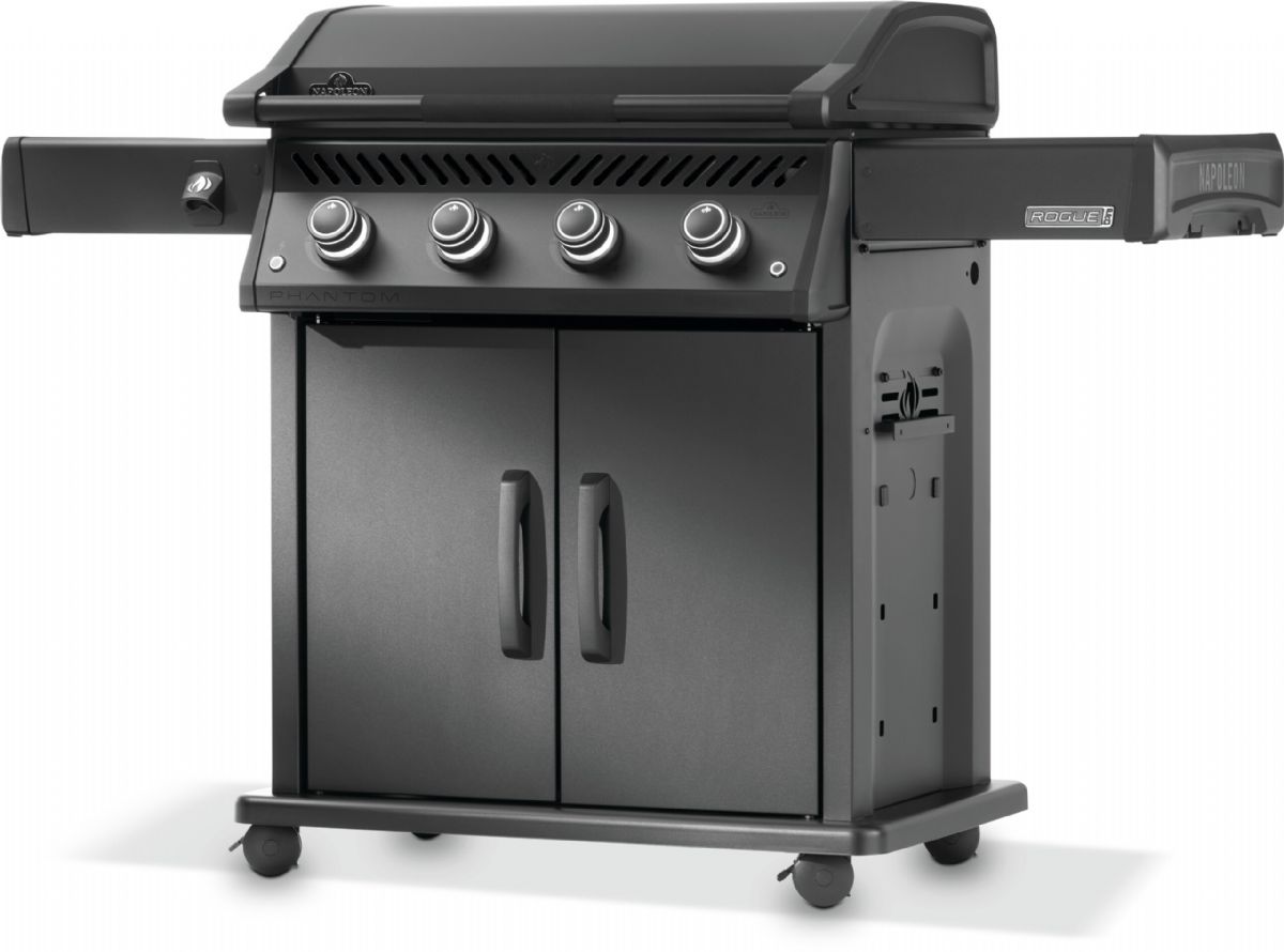 Den mattsvarta Phantom-designen gör grillen till en stilfull blickfångare, med: LED-belysta reglage, fällbara sidobord med integrerad kapsylöppnare, en stor droppbricka och lättrullande hjul för enkel förflyttning.