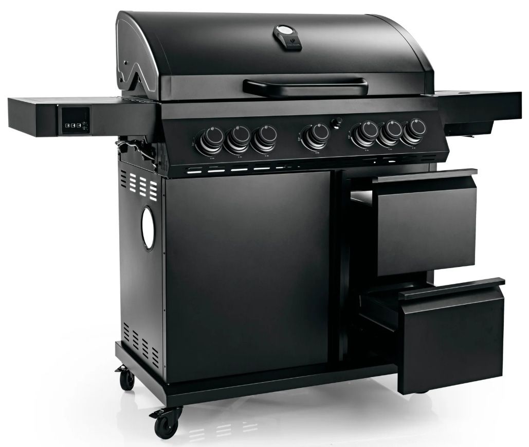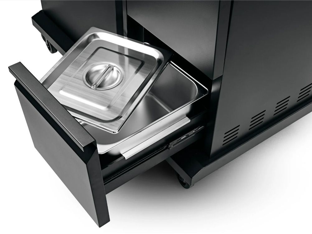 Cool Black MaxX 5.2 är utrustad med unika utdragbara förvaringslådor, inklusive en inbyggd kylbox som håller drycker och ingredienser svala. Inuti skåpet finns en dedikerad plats för gasolflaskan. Grillen har även en inbyggd instickstermometer för exakt temperaturkontroll.